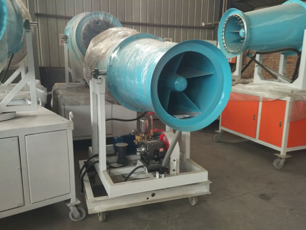 除尘雾炮机当风机旋转时,在喷雾机的出风管内产生高速气流,把喷头喷出的雾化水雾通过高压气流将雾滴进一步雾化成更细小的雾滴后吹向靶标。除尘雾炮机的喷雾量由调量阀进行控制,除尘雾炮机喷出的雾滴大小可以通过改变水泵压力来进行调整,除尘雾炮机的喷射方向可以通过改变出风管的位置来进行调节(自动型除尘雾炮机可以