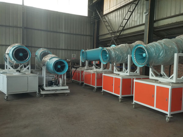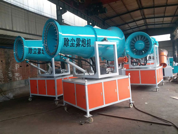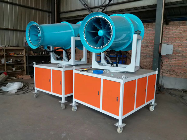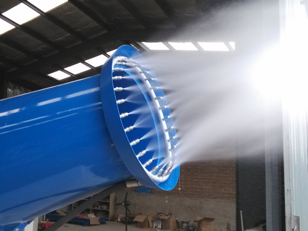 风机是除尘雾炮机的一个主要部件。风机的选择直接影响到雾炮机的工作效率和雾化效果。雾炮机依靠风机喷出的气流将雾滴进一步破碎雾化,并使雾滴具有足够的动能穿透粉尘。这样伴有微小气注以的雾滴就填充于粉尘颗粒之间与粉尘沾着降落。除尘雾炮机上所用的风机为轴流式风机,由于轴流风机具有风量大、效率高、风速柔和均匀